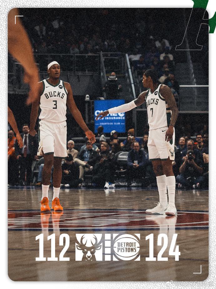 北京时间12月7日,NBA常规赛雄鹿客场对阵活塞,双方均是背靠背第二场。活塞借助7人上双团队攻势,最多时刻领先27分优势,最终活塞124-112战胜雄鹿巩固东部第一,雄鹿遭遇2连败,雄鹿最近12战10败,活塞最近18年首次单赛季两次击败雄鹿。