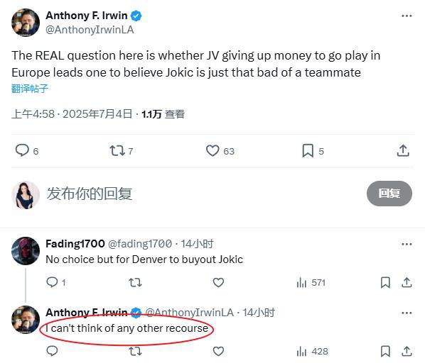 对此,湖人记者Anthony F. Irwin在社交媒体上发文:“问题的关键在于,瓦兰丘纳斯放弃金钱选择去欧洲打球,是否会让人们相信为约基奇是个糟糕的队友。”